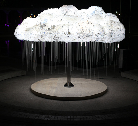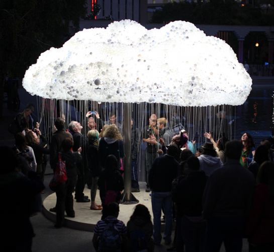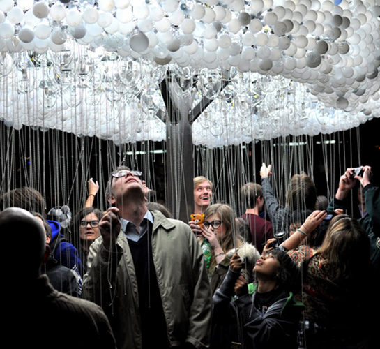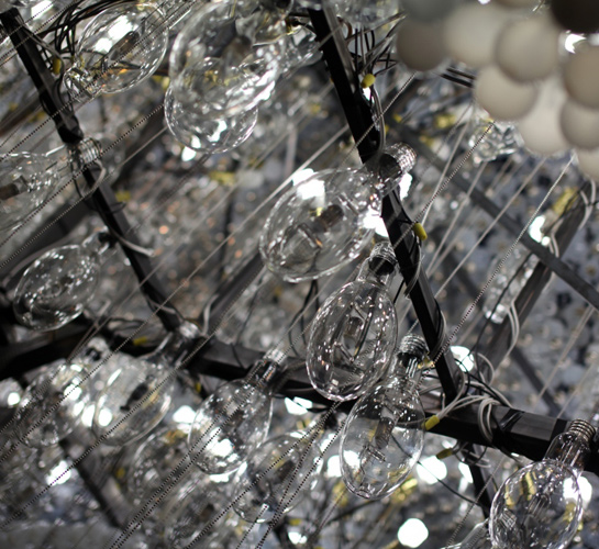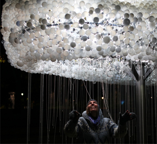 CLOUD is a large-scale interactive art installation by Caitlind Brown for Nuit Blanche Calgary. The project was made using more than 5000 illuminated and burnt out light bulbs. Viewers were invited to participate in the installation by standing underneath and pulling the metal strings. This switched the lights on and off and resulted in a flickering electrical cloud. Photo above by Doug Wong.